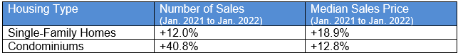 According to statistics released by the Honolulu Board of REALTORS®, the number of sales of both single-family homes and condos was up year-over-year in January 2022, as was the median sales price.
